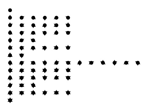 To display the solutions requires 63 different glyphs to show each piece in each possible orientation. For the sake of completeness glyph 64 is added which is a circle with no points on the edge. Often a complete solution is not much more work than just covering what we think we will need. Here are the pieces showing all possible orientations of each piece.